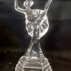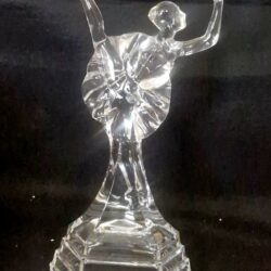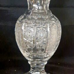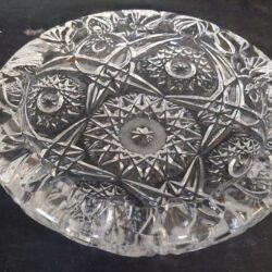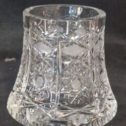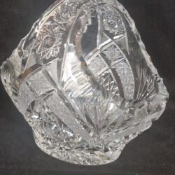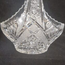 Deze afbeelding toont een antieke kristallen mand, van Boheems handgeslepen kristal, vaak gekenmerkt door ingewikkelde patronen zoals ‘hobstars’ en sterontwerpen.