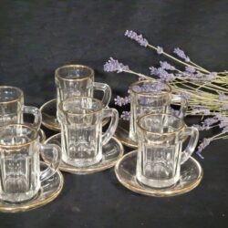 Set van 6 schitterende Turkse theeglazen met gouden rand + onderbordjesBreng een vleugje luxe aan je theemomenten met deze prachtige