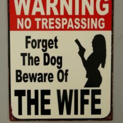 Metalen wanddecoratie. No trespassing. Forget the dog. Beware f the wife. 20×25 cm art. nr 321.a30