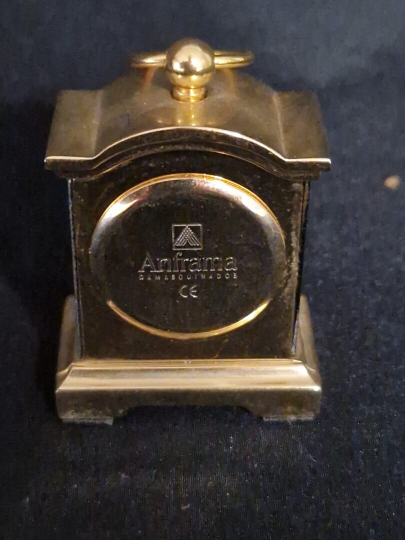 Dit is een miniatuur koetsklok, gemaakt door Anframa of Credan SA, bekend om hun damasquinado (damastwerk) stijl uit Toledo, Spanje.