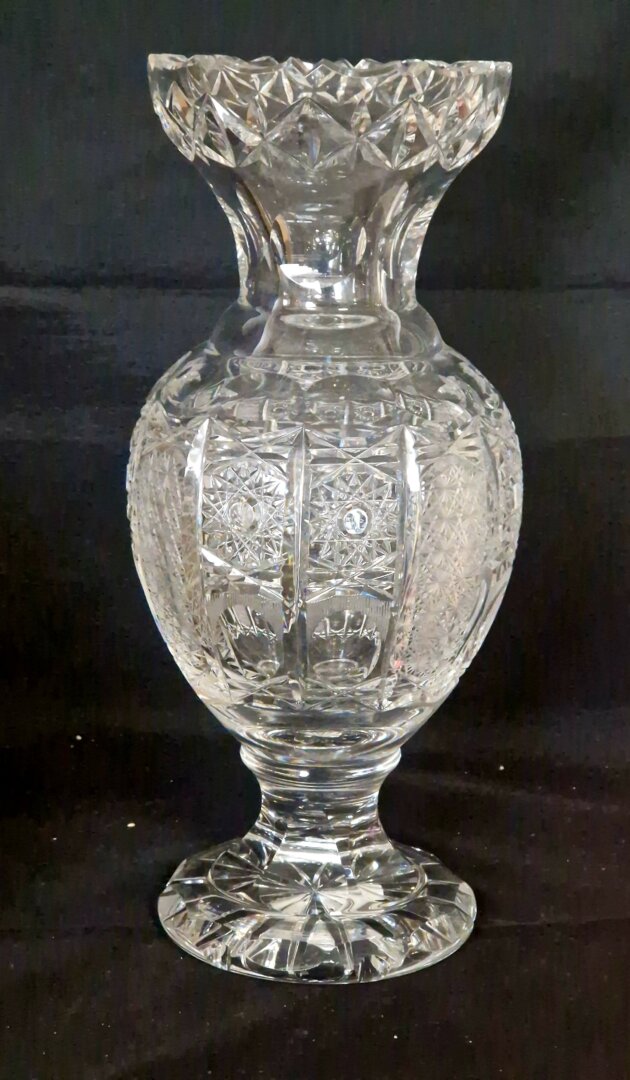 - Het is een heldere kristallen vaas met uitvoerig handgeslepen patronen.