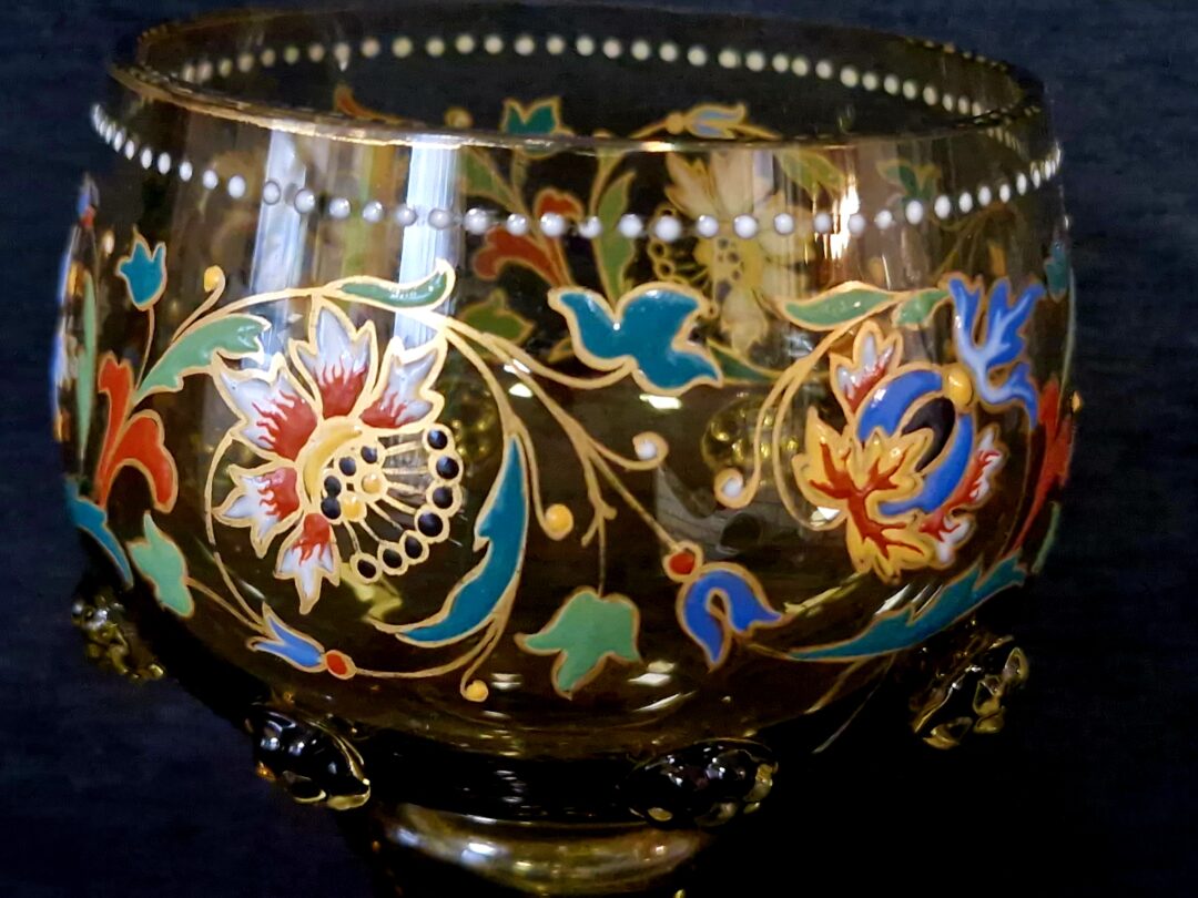 Prachtige geëmailleerde kelkbeker van Boheems/Tsjechisch glas, uitgevoerd in de verfijnde Moser-stijl.