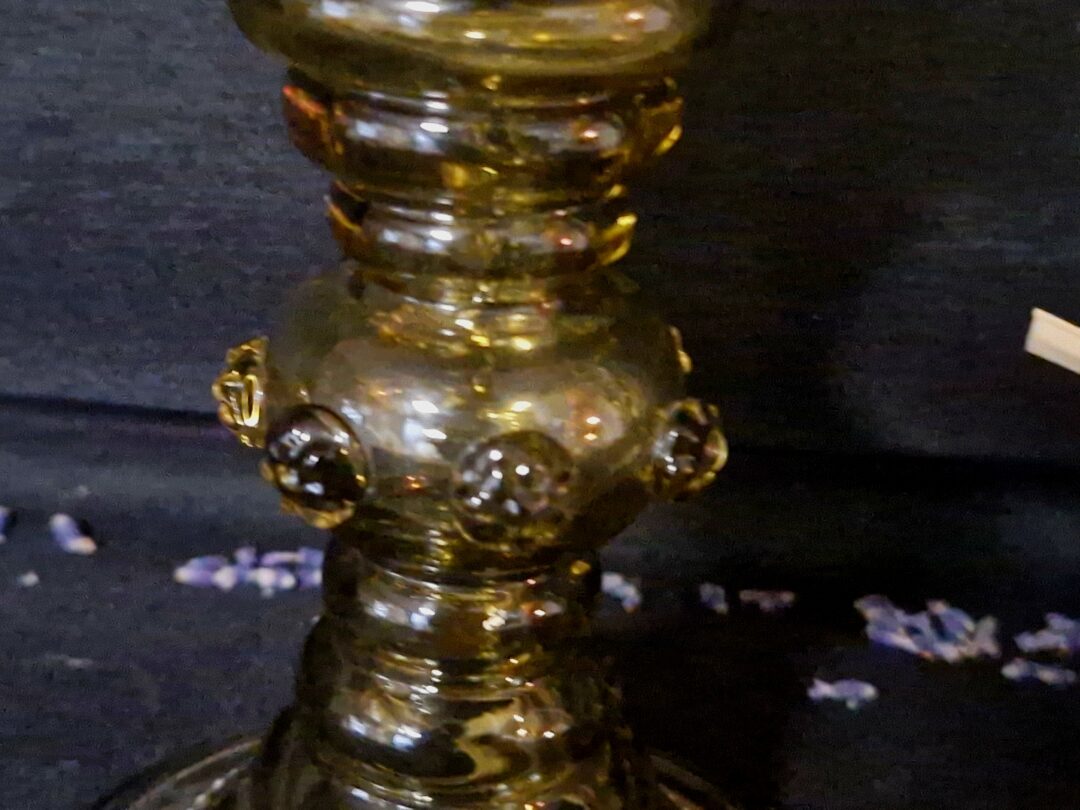 Rijkelijk versierd met delicate details en een tijdloze uitstraling – een uniek stukje vintage/antiek glaswerk voor verzamelaars of als pronkstuk in je vitrinekast.