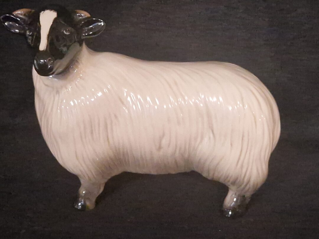 Dit fijn gemodelleerde en prachtig beschilderde schaap met zwart gezicht is iets meer dan 16,5 cm hoog en ongeveer 21,5 cm lang. Aan de achterpoot is een kleine chip.
