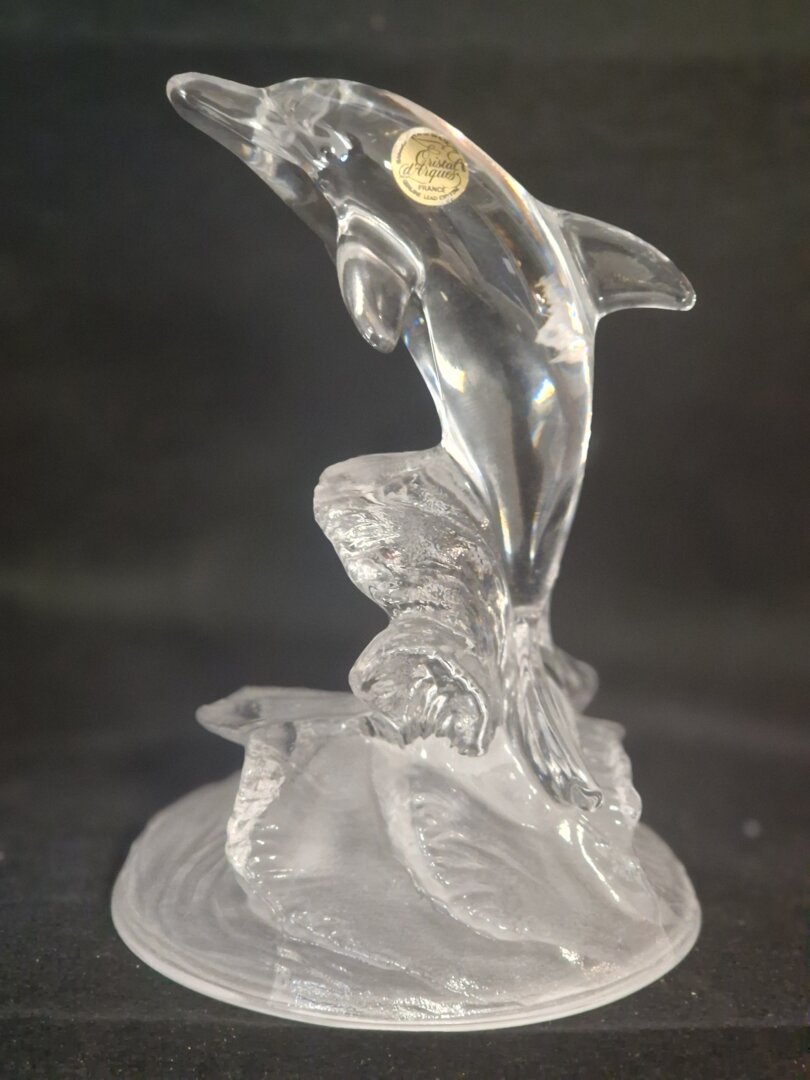 Dit object is een vintage kristallen dolfijnbeeldje van het merk Cristal d’Arques uit Frankrijk.
