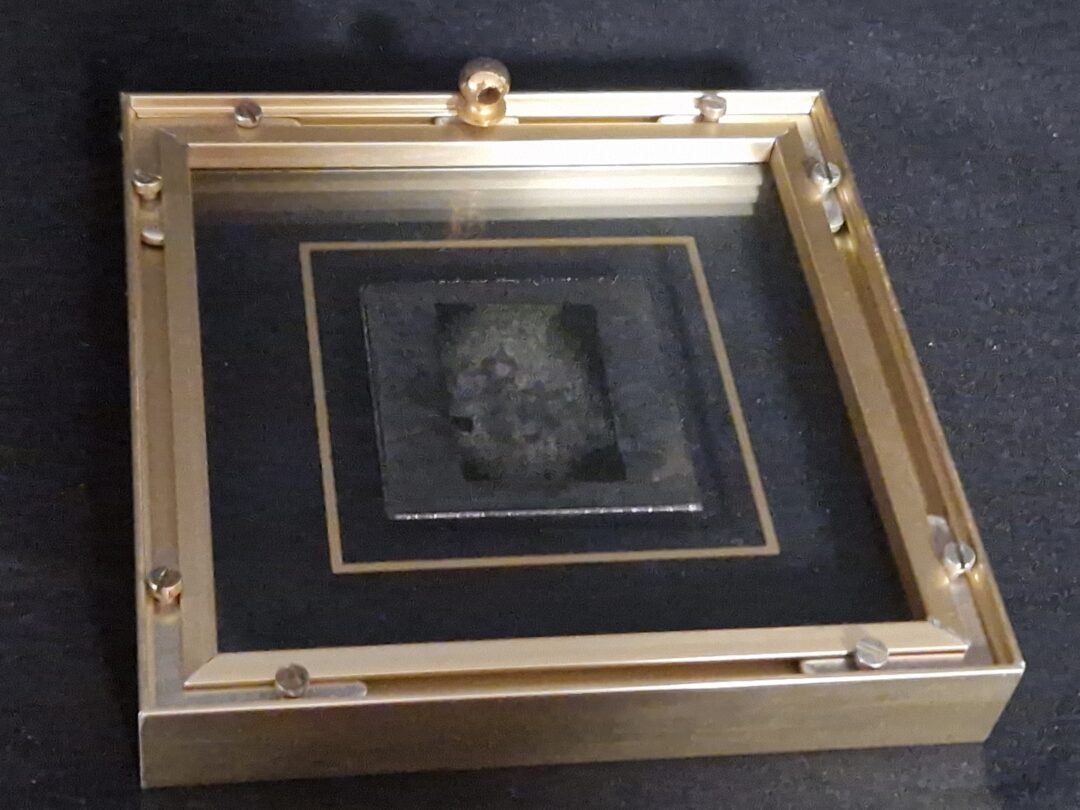 Dit is een ingelijst kunstwerk met een traditioneel Spaans damascene-ontwerp, bekend als ‘Damasquinado de Toledo’.