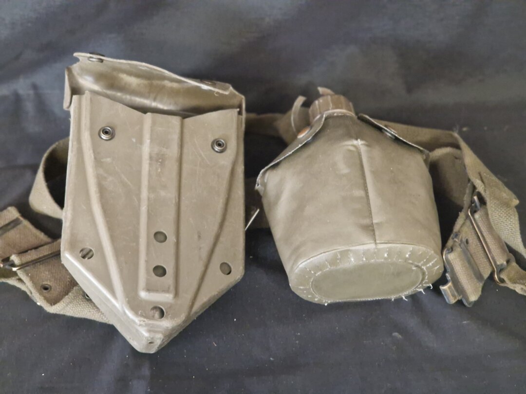 - Type: Vintage militaire uitrusting (veldfles en pouch).