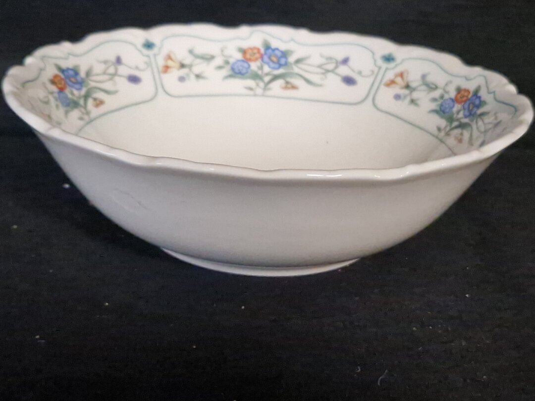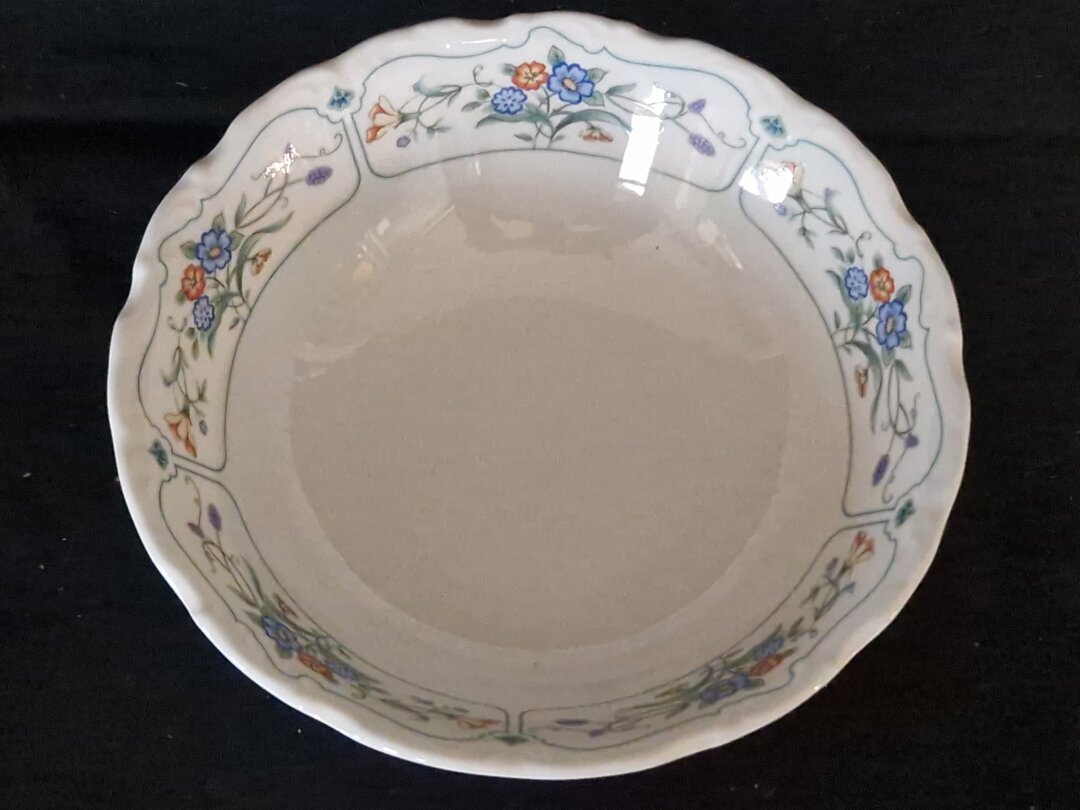 - Kenmerken: Porselein met een kleurrijk bloemmotief en een geschulpte rand.