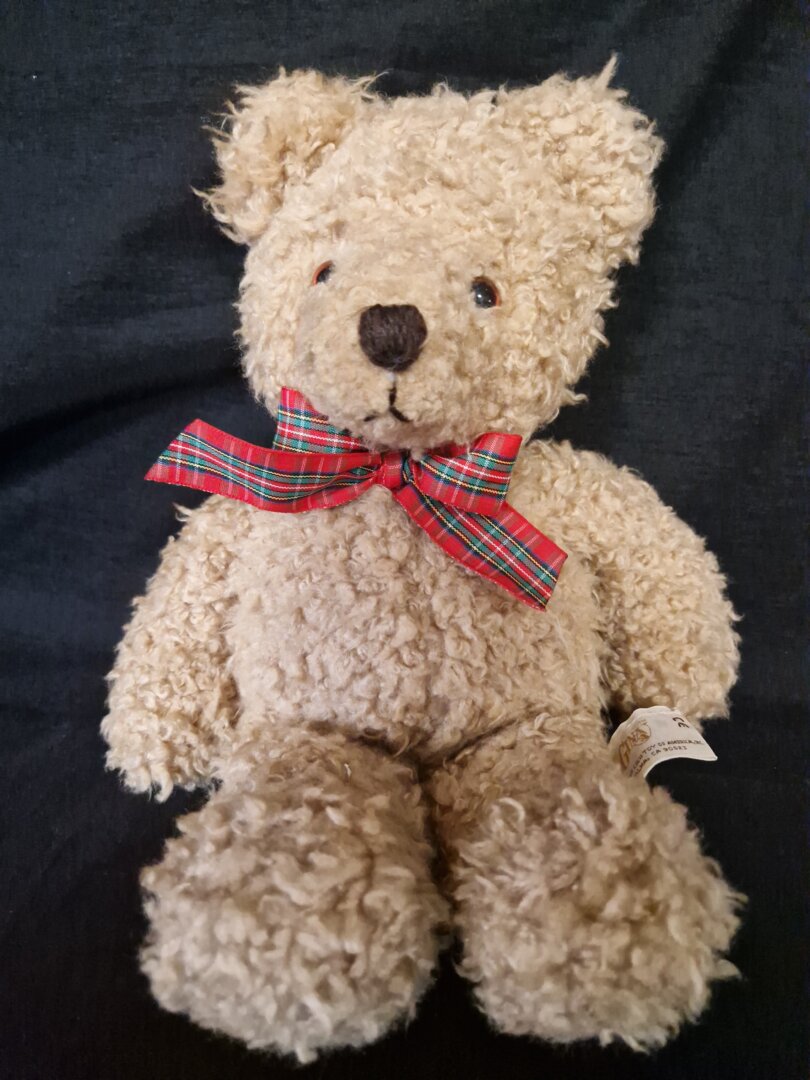 - Kenmerken: Beige gekruld pluche met een rood-groene Schotse ruit strik.