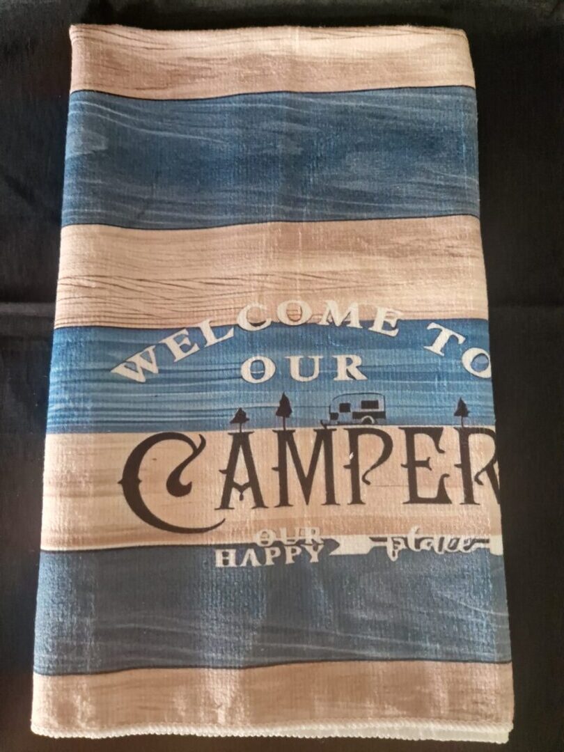 “Breng het campergevoel in je badkamer met deze Happy Camper gastendoek.”
