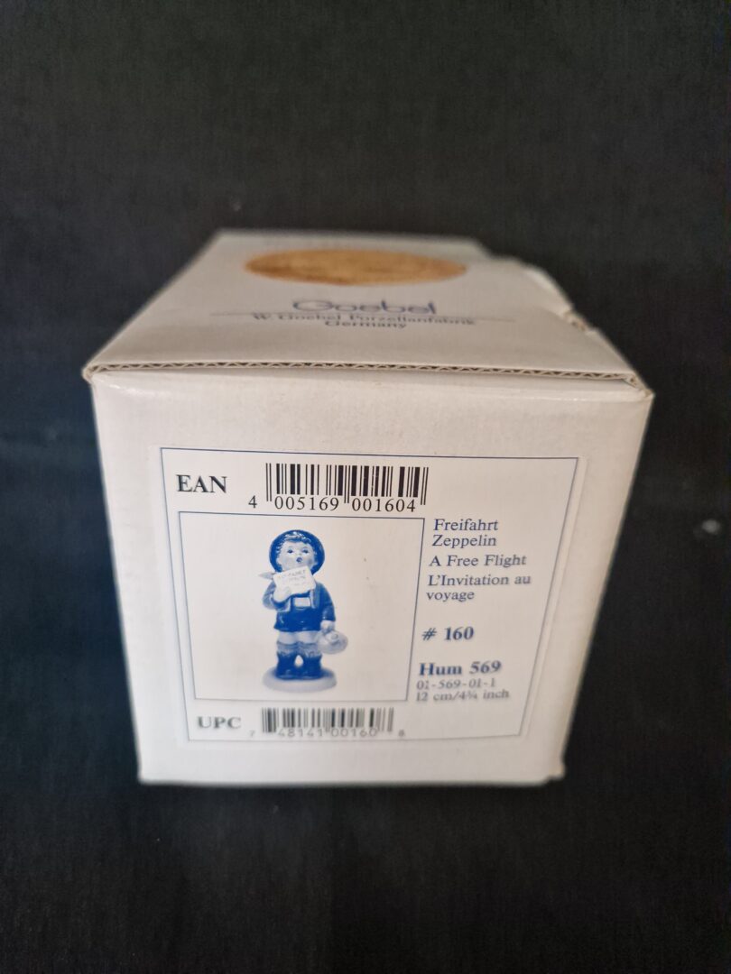 De afbeelding toont een Hummel-beeldje, ook wel bekend als een Goebel-figuur, genaamd “Freifahrt Zeppelin”. Met orginele doos