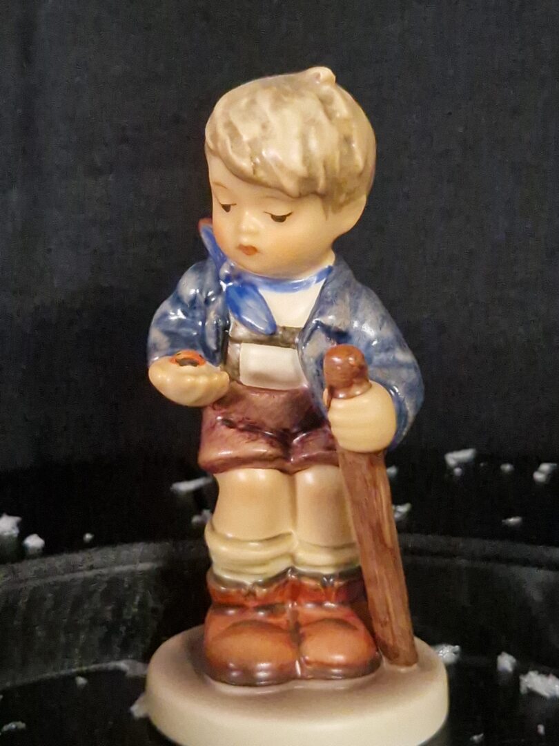 De afbeelding toont een Goebel Hummel-beeldje, genaamd Ich tu dir nix, Summertime suptrise