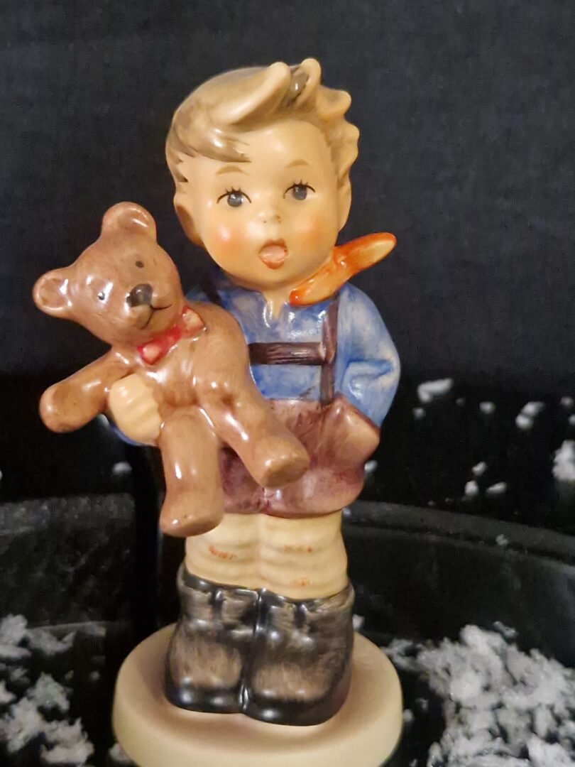 De afbeelding toont een Goebel Hummel-beeldje, genaamd “A Christmas Gift“.Ā Dit specifieke beeldje, met nummer 2074/A, toont een jonge jongen die een teddybeer vasthoudt.Ā