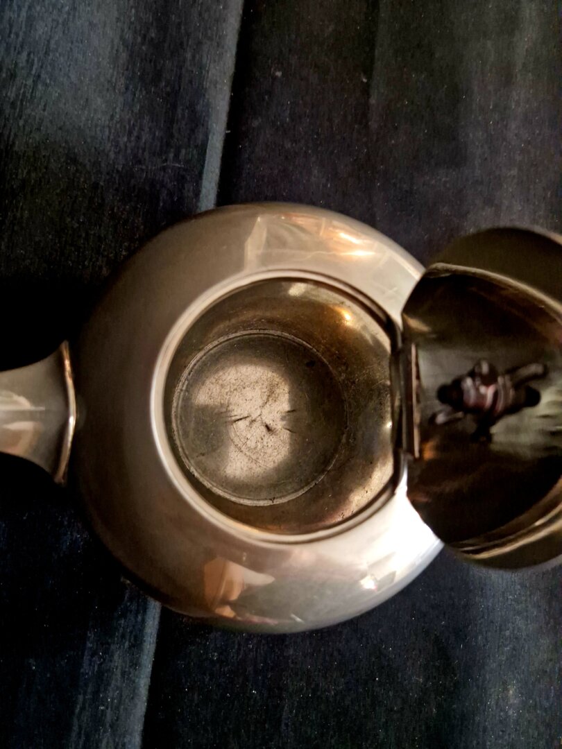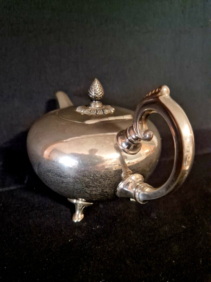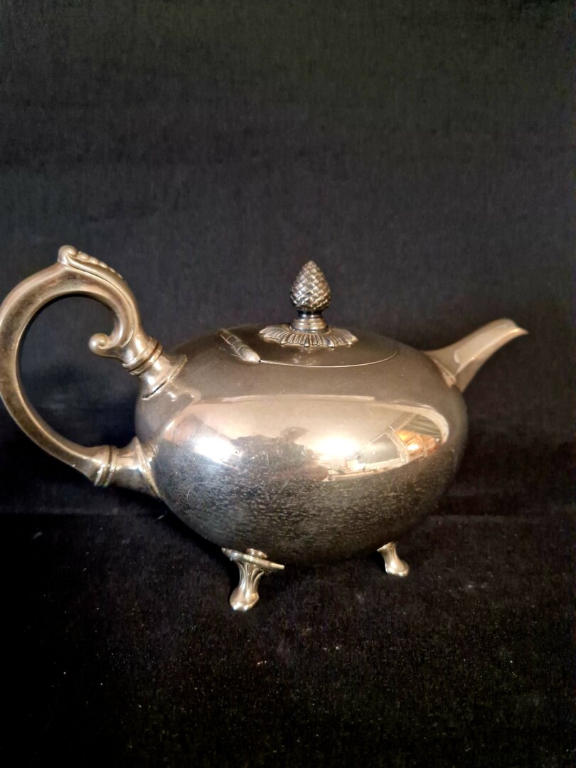 Zilvertinnen theepotje gedecoreerd in Rococo stijl, gemaakt rond 1910 in Tiel door de firma Kurz. De pot heeft een filter aan de binnenzijde van de tuit.