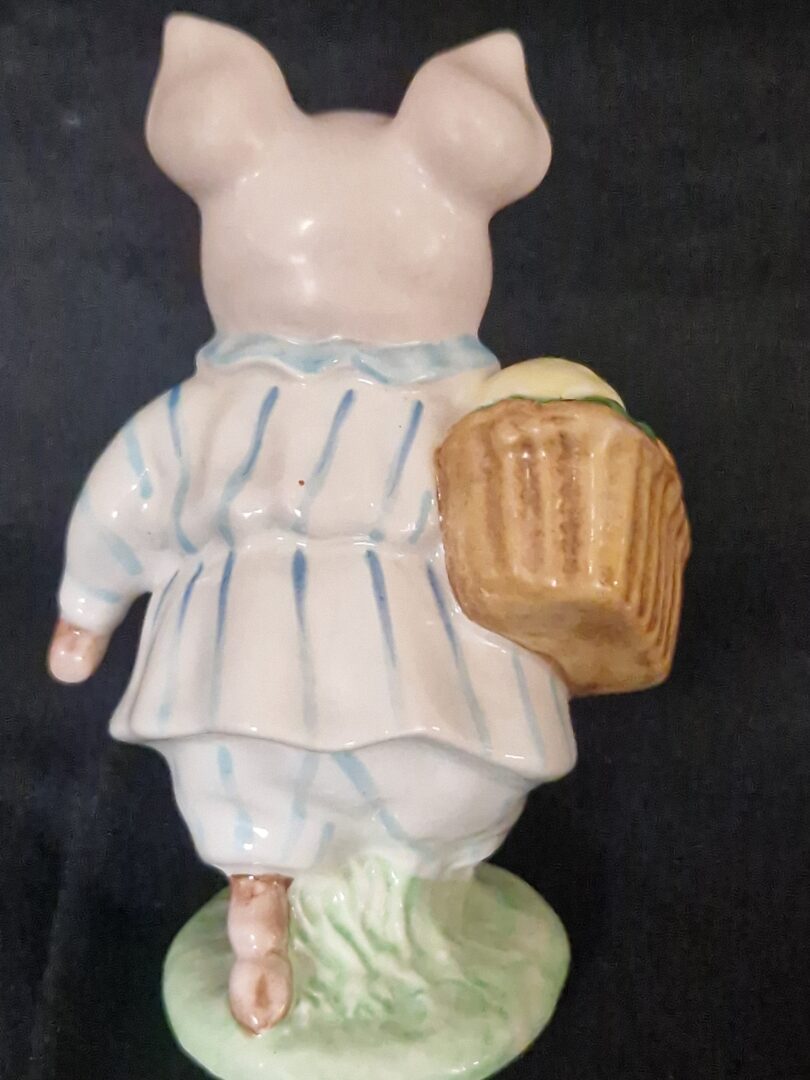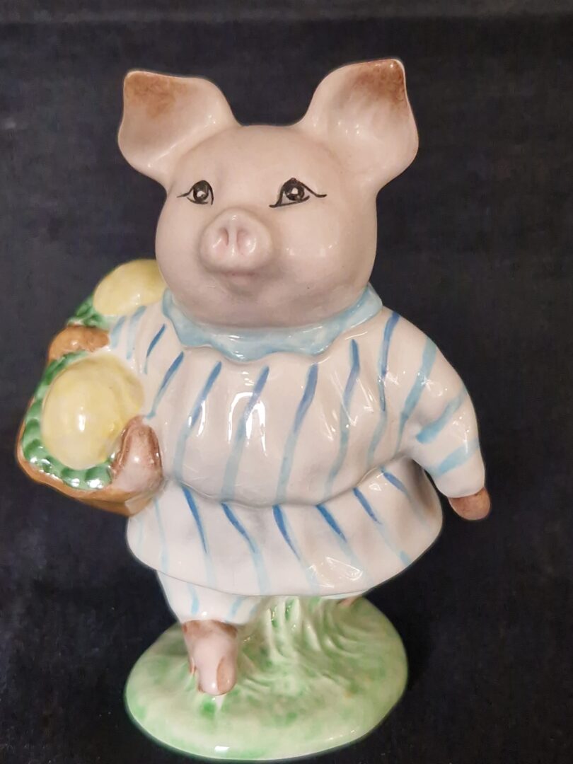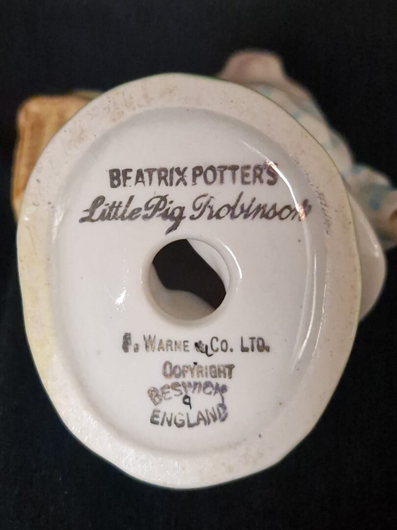 Een prachtig beeldje van Little Pig Robinson, gebaseerd op het kunstwerk van Beatrix Potter. Het beeldje is geproduceerd door F. Warne and Co., Beswick, en is voorzien van de gouden ovale stempel op de achterkant. Beeldje is in zeer goede staat, zonder breuken of barsten. De originele doos ontbreekt. Zou een prachtige aanvulling zijn op elke Beatrix Potter-collectie!