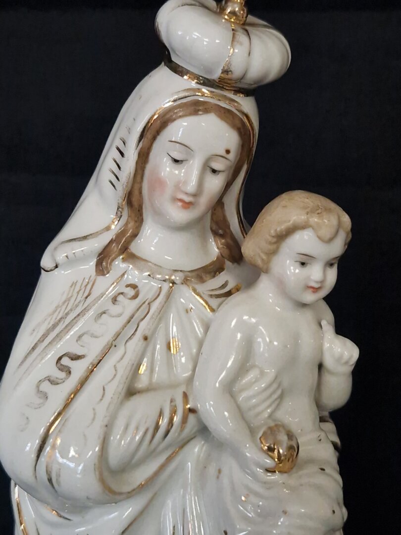 Dit beeldje is een Madonna met Kind gemaakt van porselein, vaak aangeduid als een religieus verzamelobject. 32 cm hoog