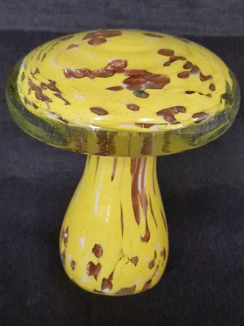 Prachtige vintage handgemaakte Murano stijl paddenstoel briefgewicht in de vorm van een paddenstoel, geel met gouden stippen.