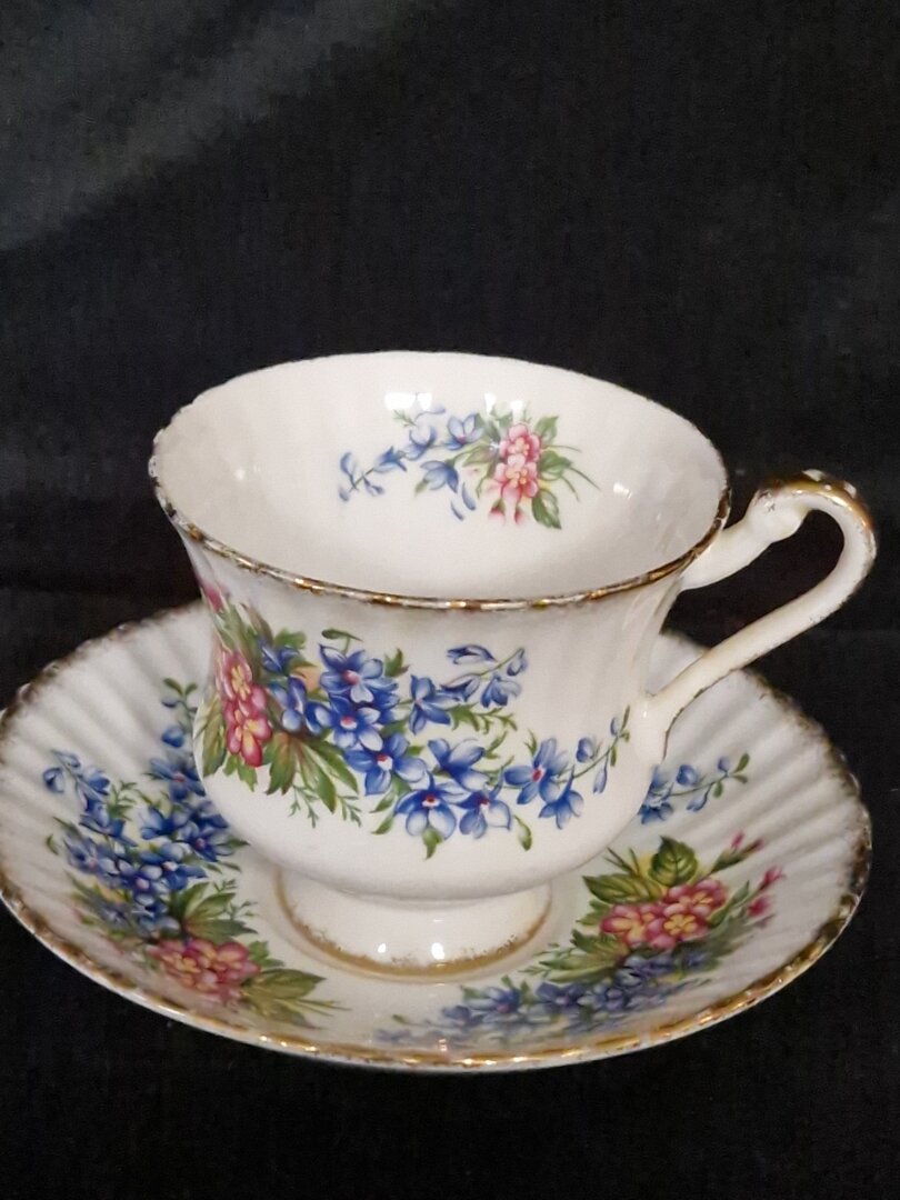 Dit is een vintage Paragon Fine Bone China kop en schotel met een roze en blauw bloemenpatroon.