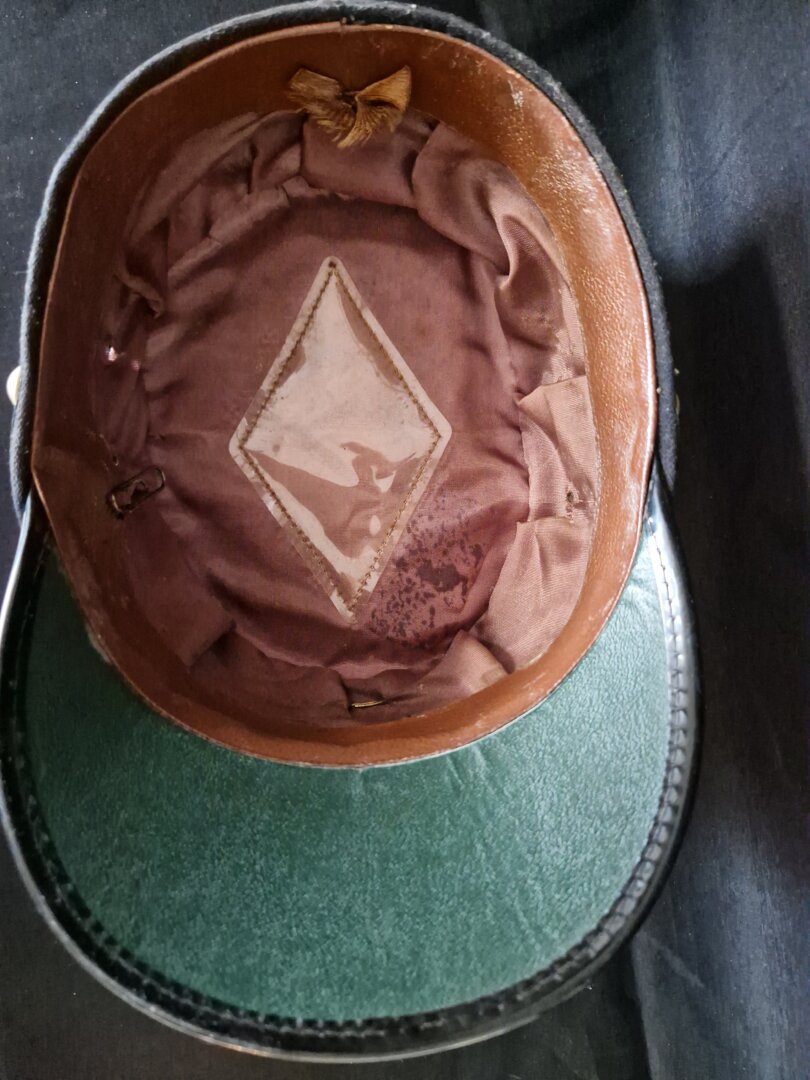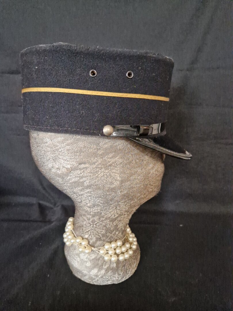 - Details: De pet heeft een donkerblauwe kleur, een zwarte lakleren klep en een zwarte kinband.