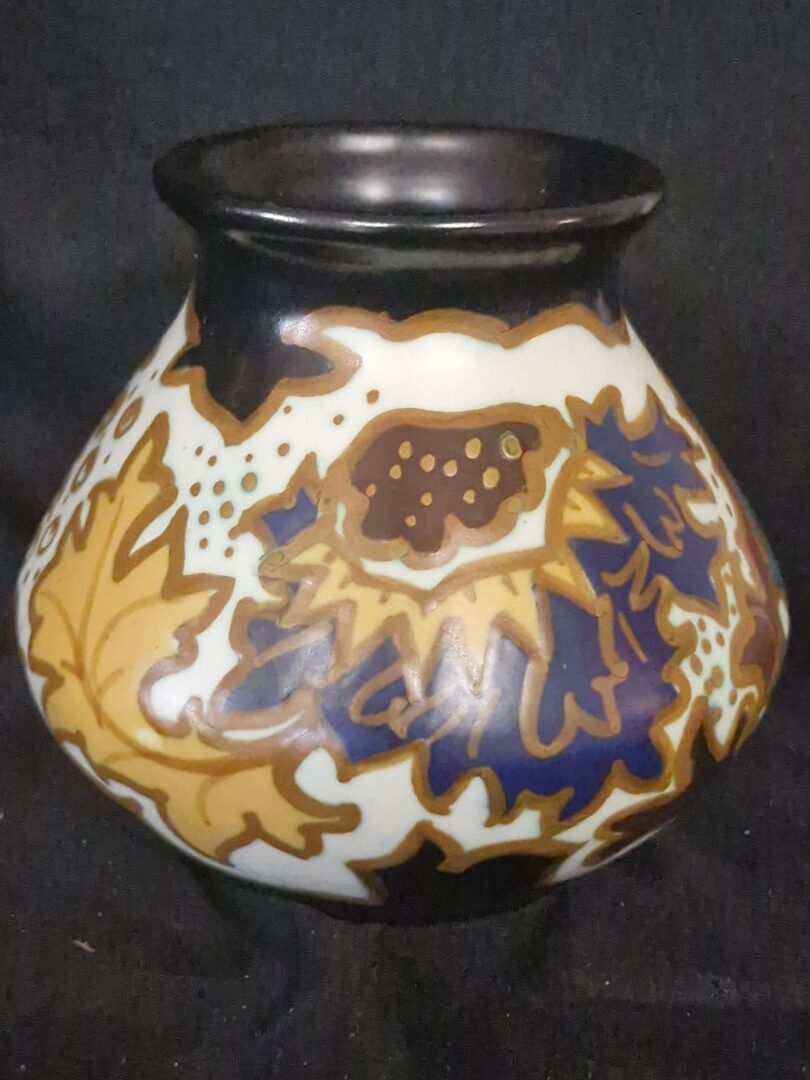 Dit is een handgeschilderde Goudse plateel vaas, vervaardigd door de Arnhemse Fayencefabriek.