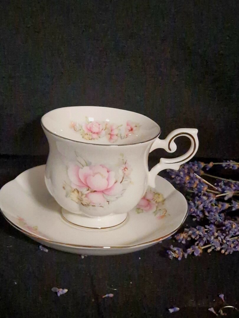 Fijn Engels porselein met delicate decoraties en een subtiele gouden rand, perfect voor verzamelaars of voor een stijlvolle theetafel.