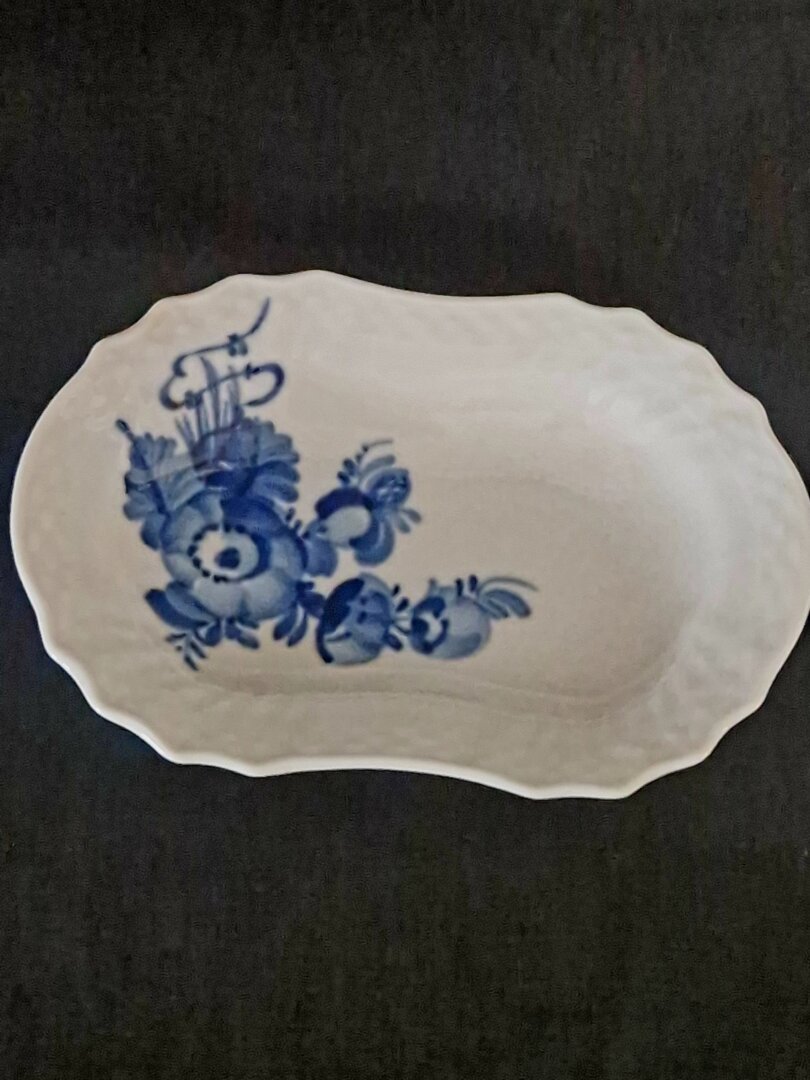 Dit is een Royal Copenhagen Blue Flowers Braided ovalen bladschotel.