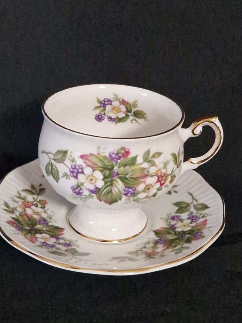 Mooie dames kop en schotel van Royal Philip met een bramenboeket.