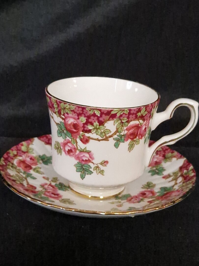 it is een vintage kop en schotel van het merk Royal Stafford in het patroon Olde English Garden.