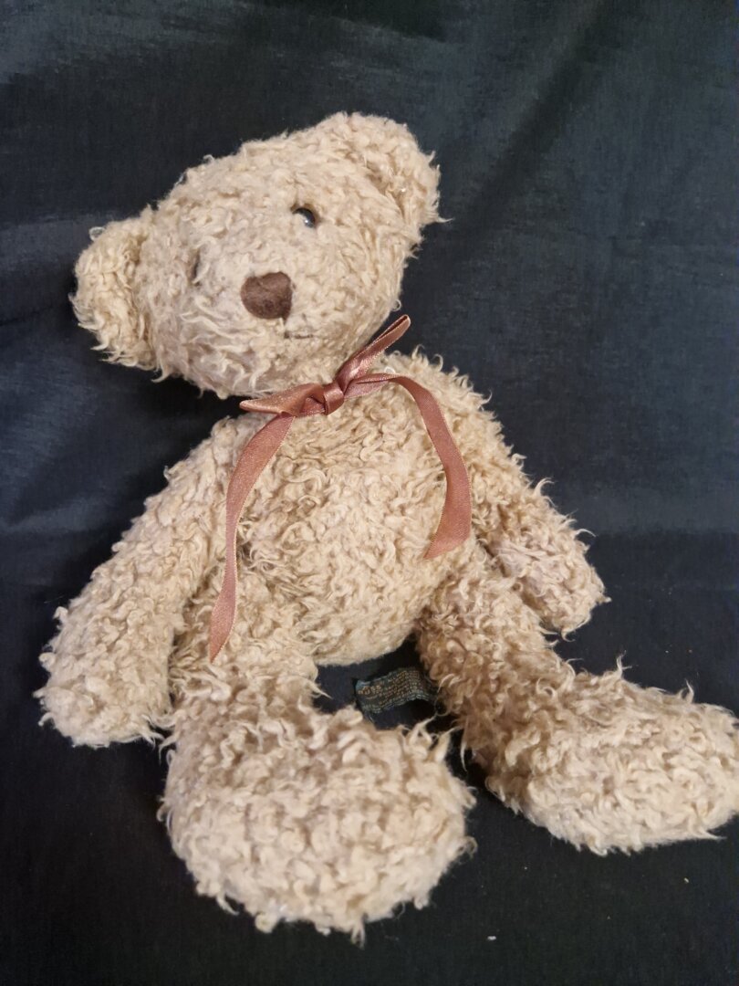 - Het is een zachte, lichtbruine knuffelbeer met een pluizige vacht en een donkerbruine neus.
