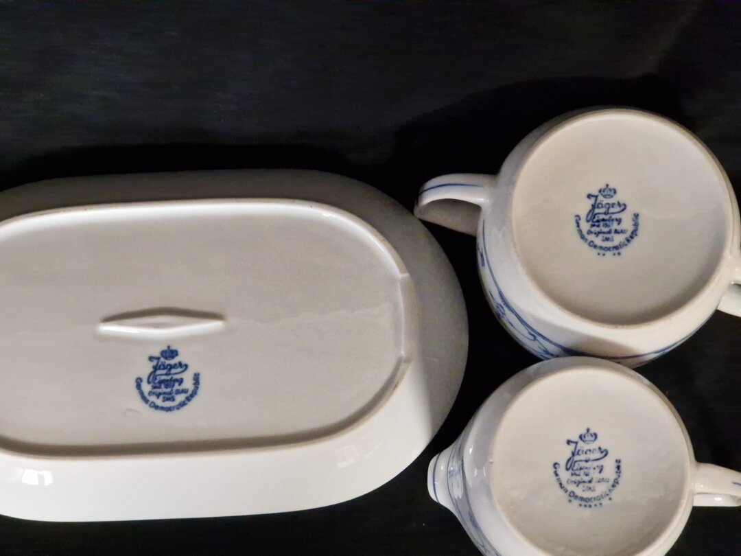 Een vintage Jäger Eisenberg room- en suikerset met dienblad, uitgevoerd in het bekende blauw-witte ‘Blau Saks’ of ‘Tangcao’ patroon.