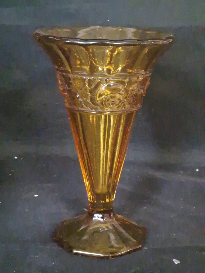 Deze vaas is een Art Deco amberkleurige glazen vaas met rozenmotief.
