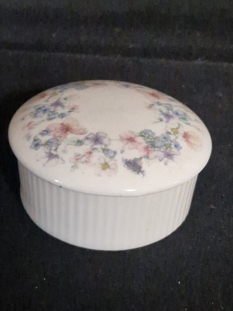 Dit is een vintage Wedgwood snuisterijendoosje in het “Angela” patroon, gemaakt van fijn Engels porselein (bone china).