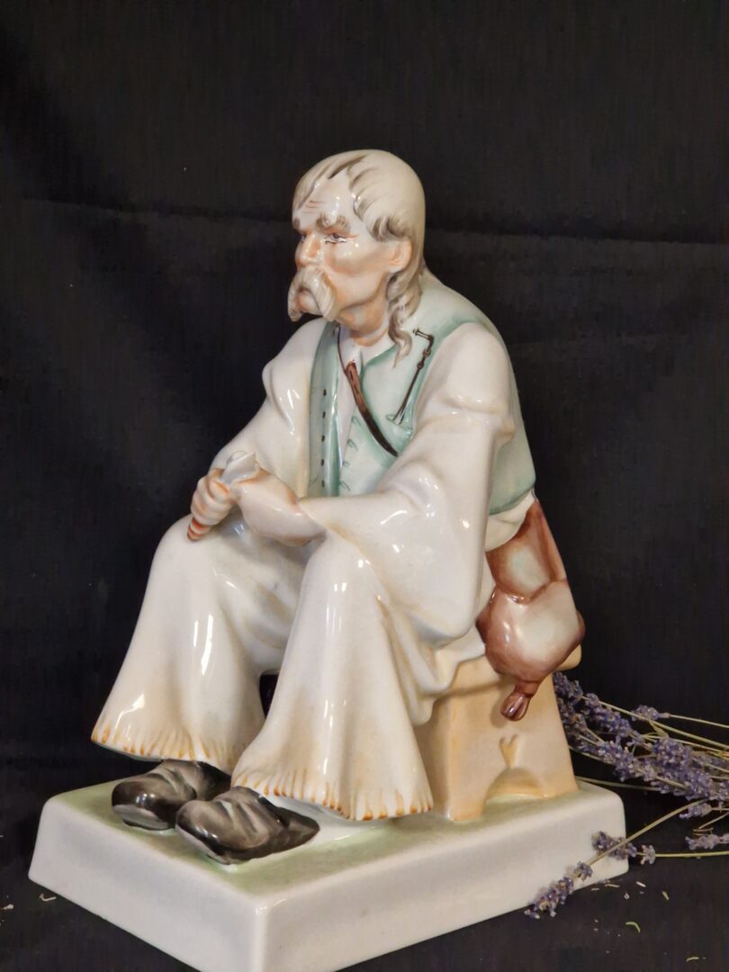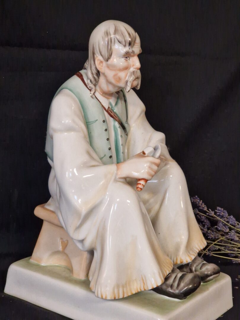 Dit is een porseleinen beeldje van een zittende boer, vervaardigd door de Hongaarse porseleinfabriek Zsolnay.Ā