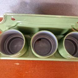 Emaille Zand zeep soda. Reseda groen. Het set is puntgaaf, alleen het zandbakje heeft een roestvlek aan de onderkant.