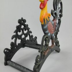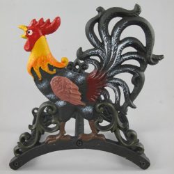 Gietijzeren tuinslanghouder. met gekleurd haantje Artikel nummer.:Ā 326.098 Lengte:24cm Breedte:14 cm Hoogte:26 cm Gewicht:2 kg