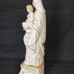 Dit beeldje is een Madonna met Kind gemaakt van porselein, vaak aangeduid als een religieus verzamelobject. 32 cm hoog Materiaal: Wit geglazuurd porselein